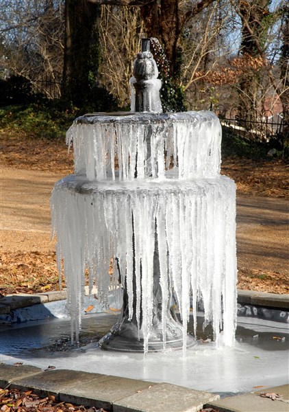 Frigid air from the North Pole invaded the area dropping temperatures into the single-digits and making an ice sculpture out of the fountain at the home of Pat and Eddie Ray on Panola Street. Warmer weather is expected by the weekend.