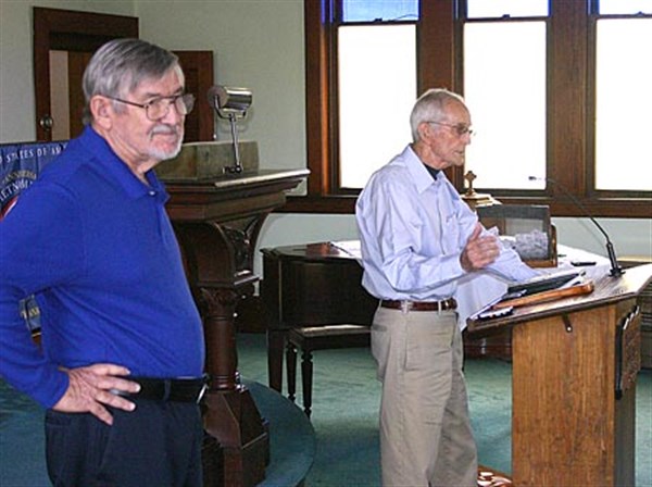 Veteran Mike Worsham (right) moderated November’s meeting as each veteran attending shared their personal story. Bob Brooks was among the first to speak.