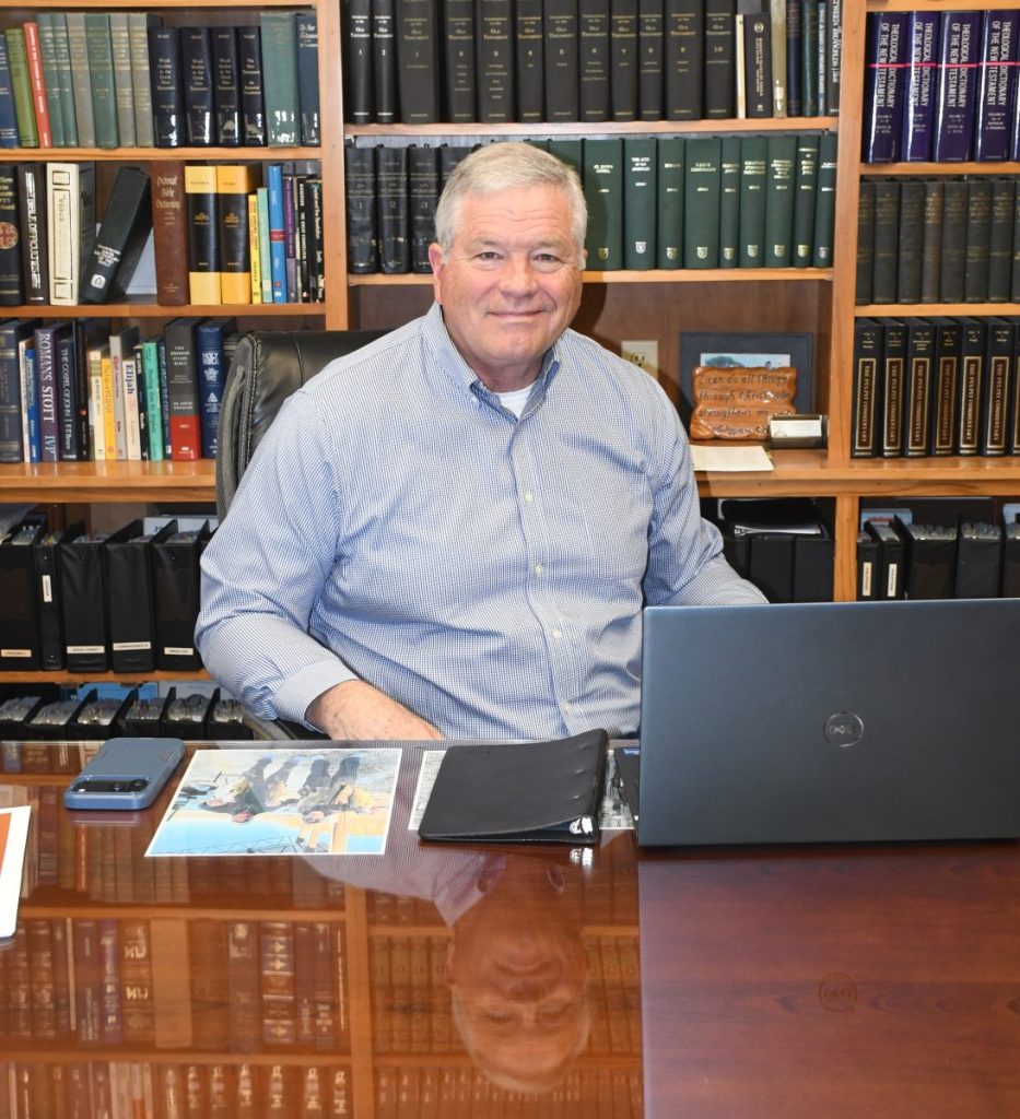 Dr. Randy Bain reflects at his desk at First Baptist Church in Water Valley ahead of his retirement after more than four decades of ministry.