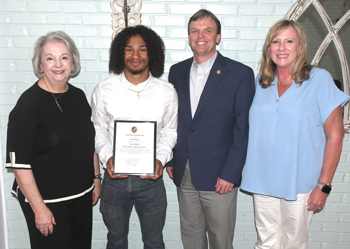 Jessie Gurner, Tyler Hill and Tonya Eubanks, members of the inaugural Zandra Walker Heart of Water Valley Scholarship committee, presented the award to Drake Mabary during Tuesday night’s Chamber reception.
