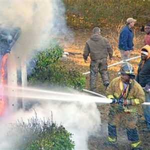 Firefighters were called to the Minor residence in the 200 block of Cook Street at 9:17 a.m. Monday to battle a blaze that was already well involved. Volunteers helped pull hose so that Water Valley Fire Chief Sherman Gooch could get water on the fire. – Photo by Jack Gurner