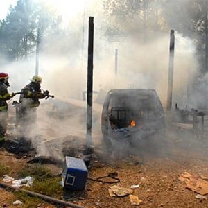 Firefighters had to deal with two blazes Tuesday; one damaged a mobile home on County Road 133 and the other destroyed a repair shop north of Coffeeville.